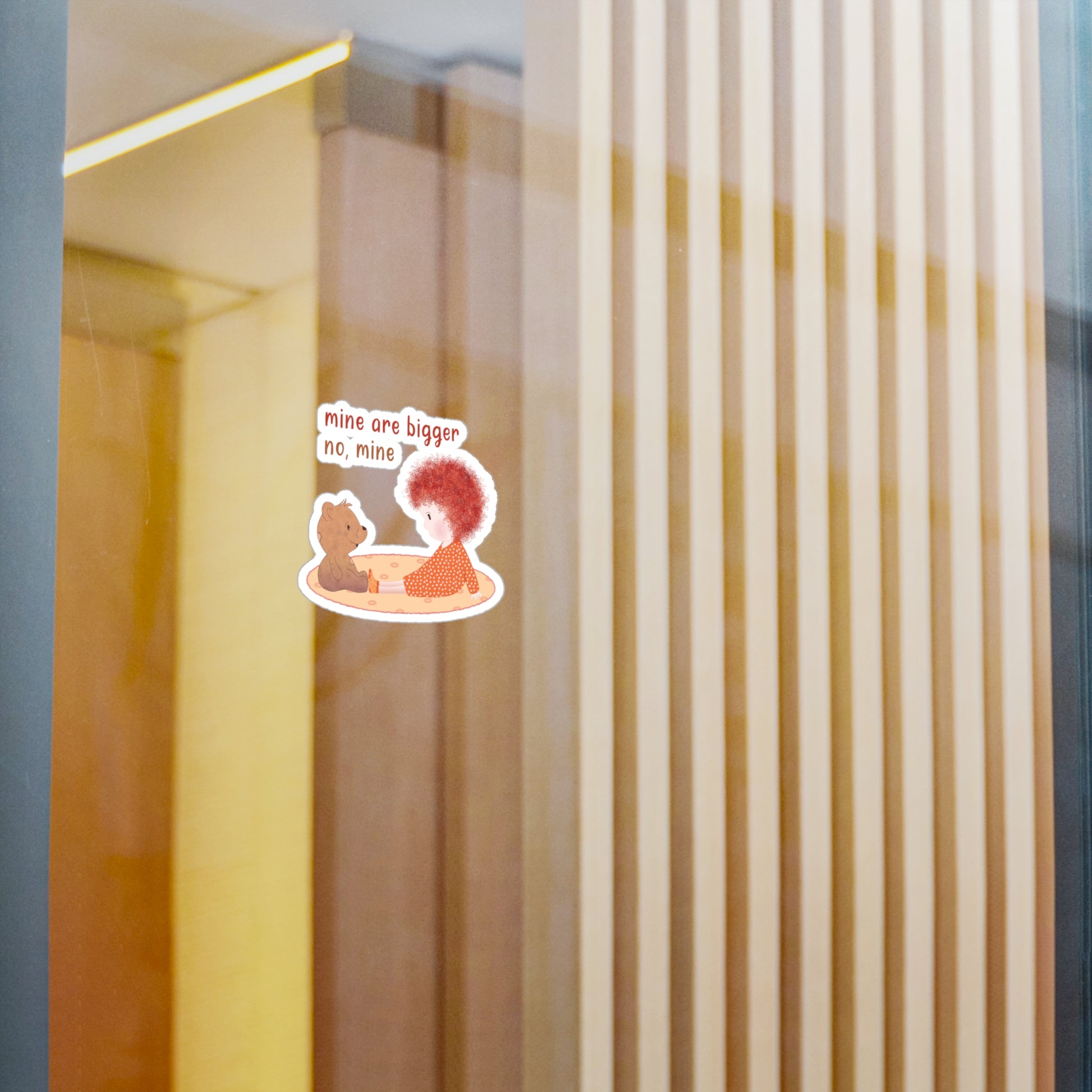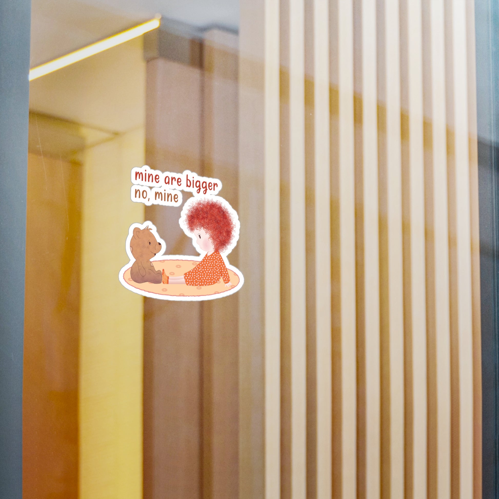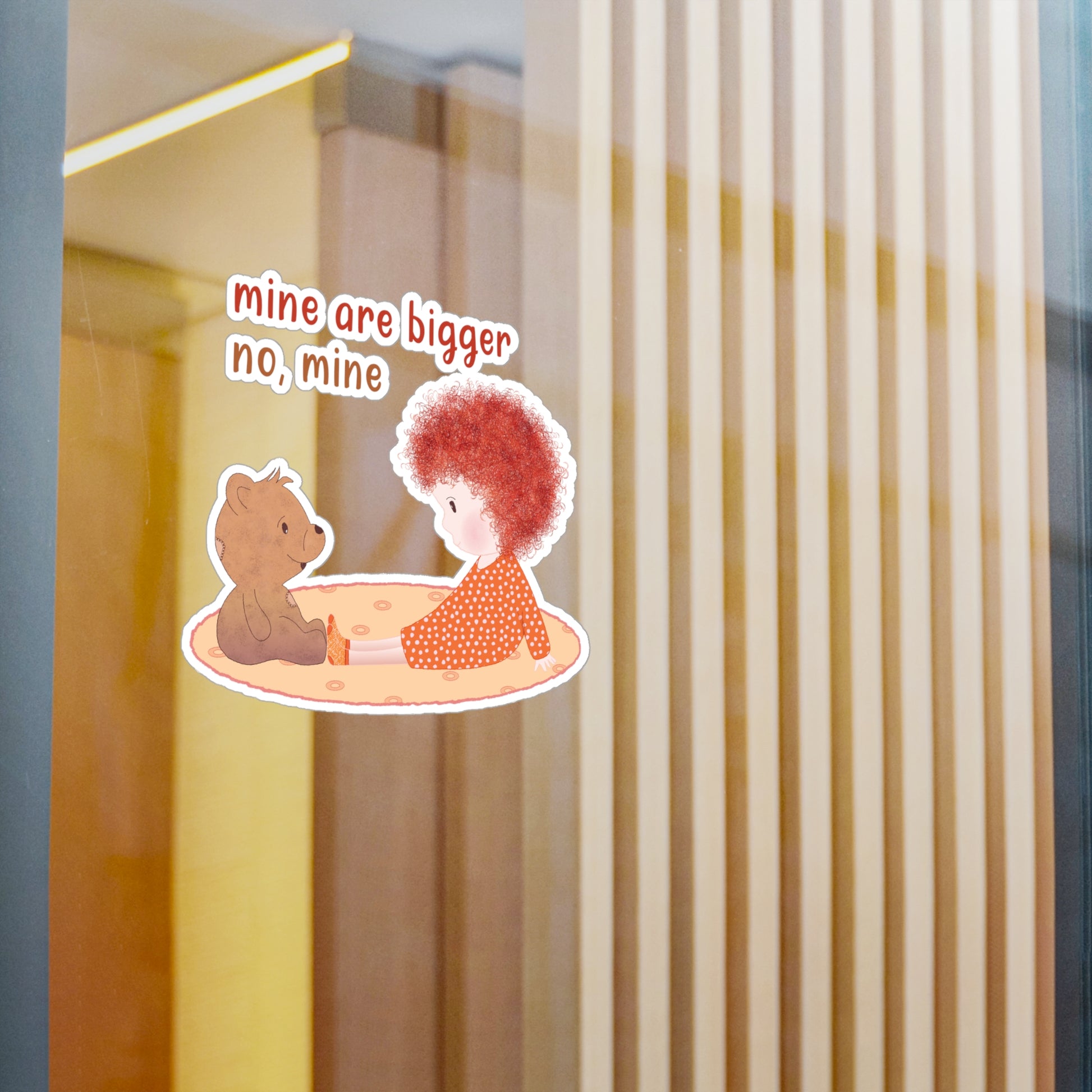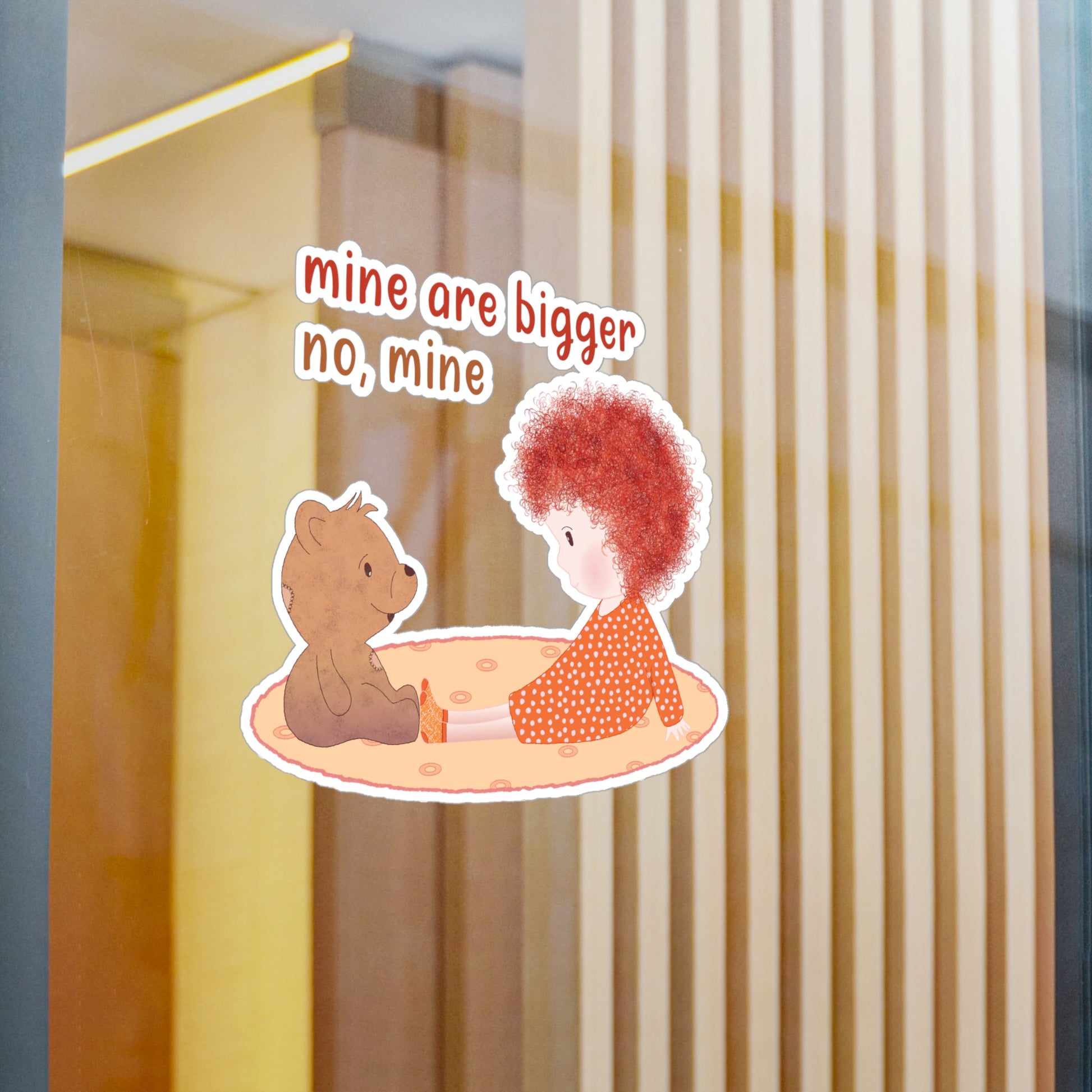 The Redhead “Mine Are Bigger” Baby Wall Decal from Kidlic turns any baby room into a place where confidence is loud and opinions are… bigger. Featuring adorable red curls, a loyal teddy, and the classic phrase “Mine are bigger. No, mine!”, this funny nursery wall decal captures everyday toddler logic parents recognize instantly.