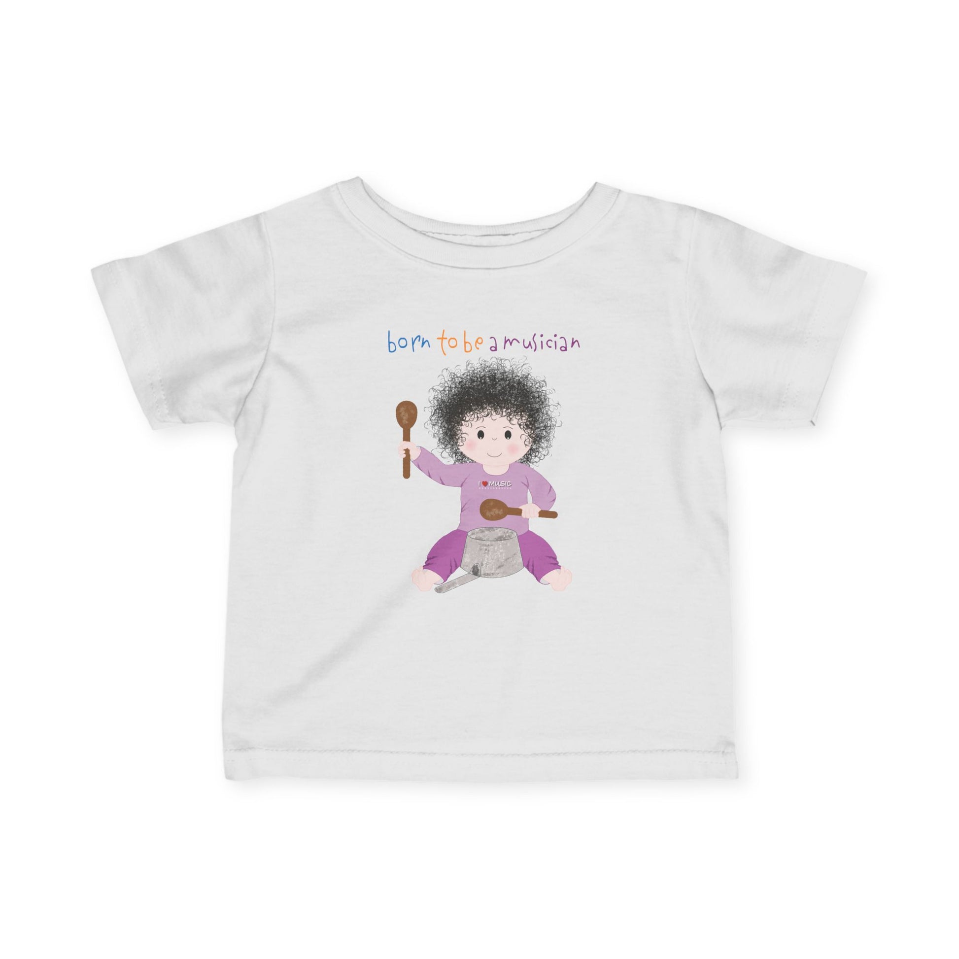 Quick Highlights: Baby t-shirt • Soft cotton feel • Funny musician artwork • Dark-haired baby character • Everyday baby & toddler wear • Designed in the USA • FREE U.S. shipping