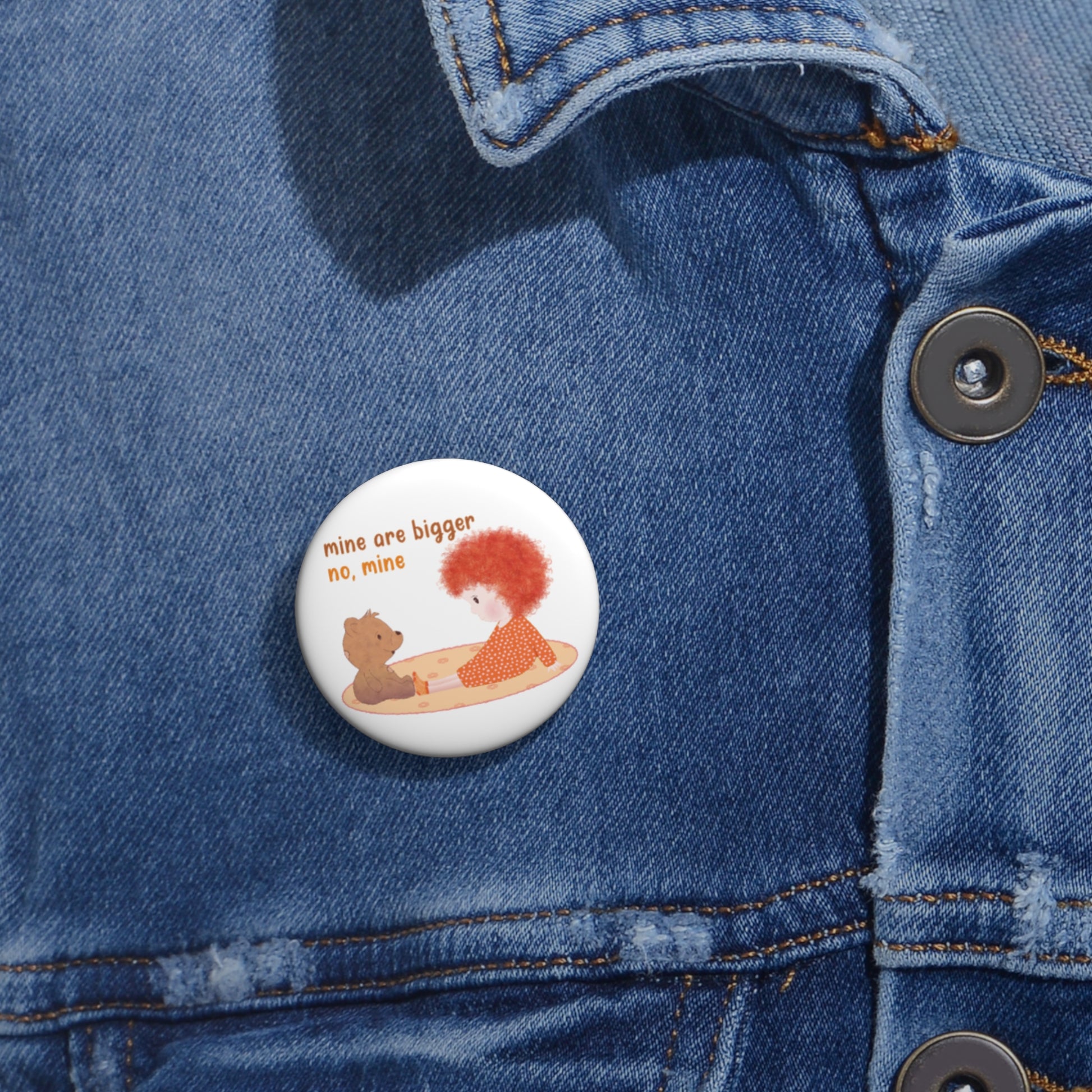 Meet the playful “Mine Are Bigger” Pin Button — featuring a fearless redhead toddler locked into the most familiar childhood debate of all. Small in size, big in attitude, and absolutely convinced they’re right.
