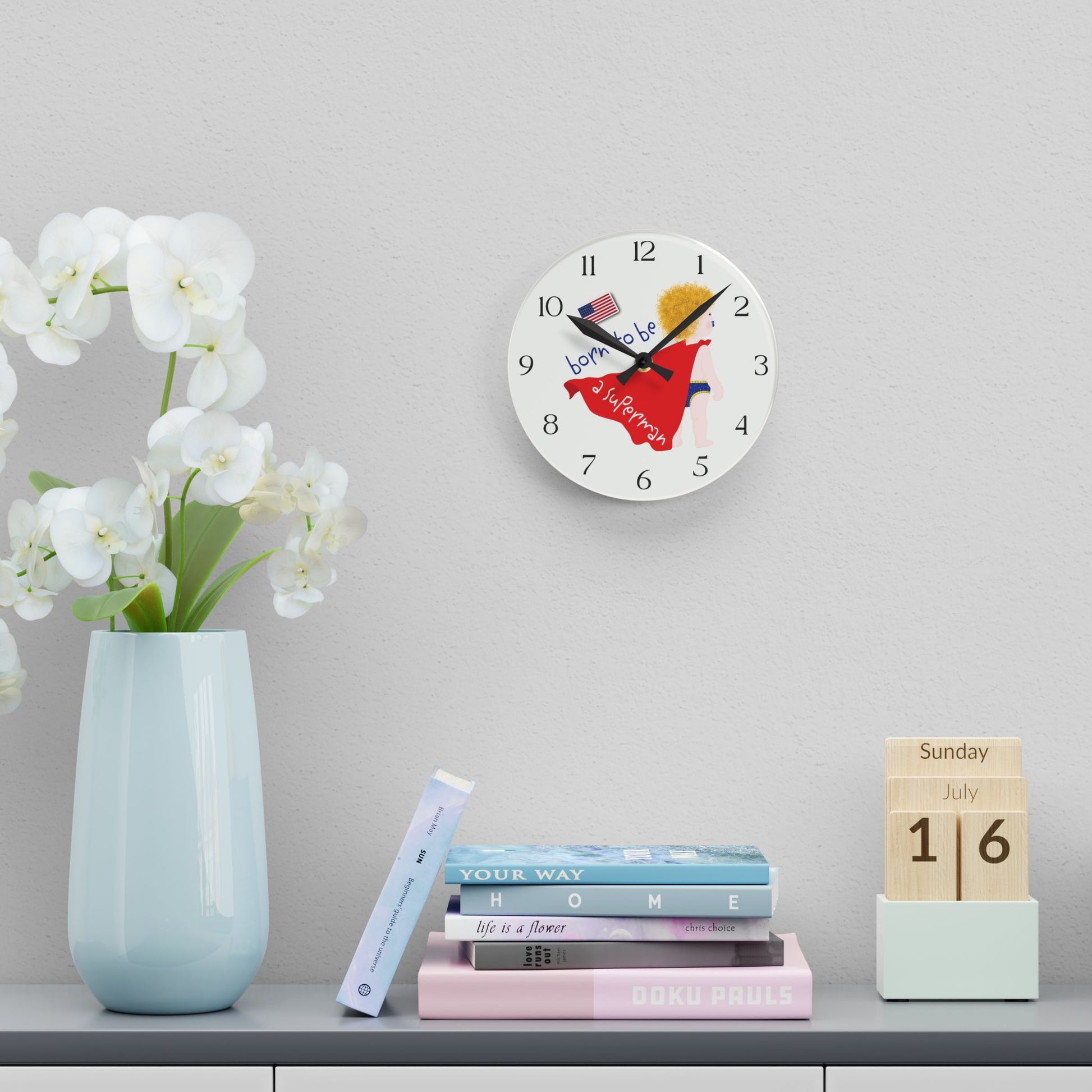 Meet the playful “Born to Be a Superman” Acrylic Wall Clock — featuring a confident blonde baby superhero ready to save the day (right after nap time). This clock captures that early-stage hero energy parents know well: bold dreams, big confidence, and absolutely no concept of bedtime.