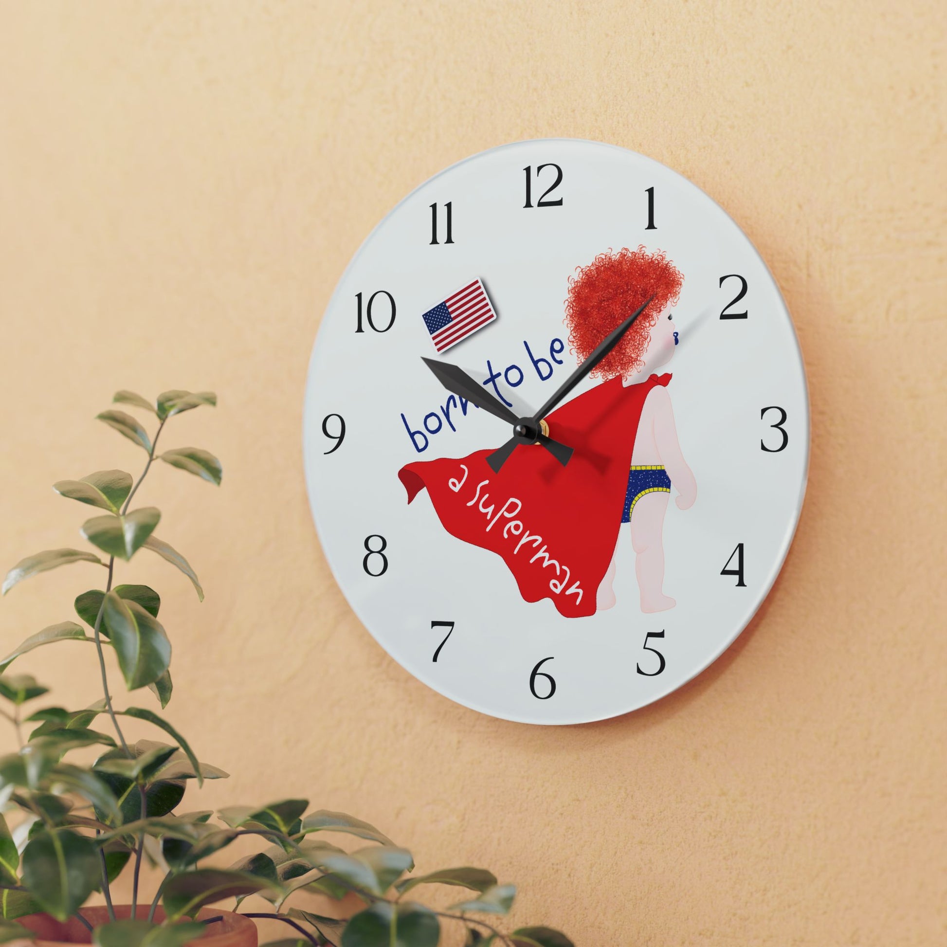 Meet the playful “Born to Be a Superman” Acrylic Wall Clock — featuring a bold redhead baby superhero with unstoppable confidence and big heroic dreams. This clock captures that early superhero energy parents recognize instantly: fearless ideas, strong opinions, and a cape-ready attitude (even before breakfast).