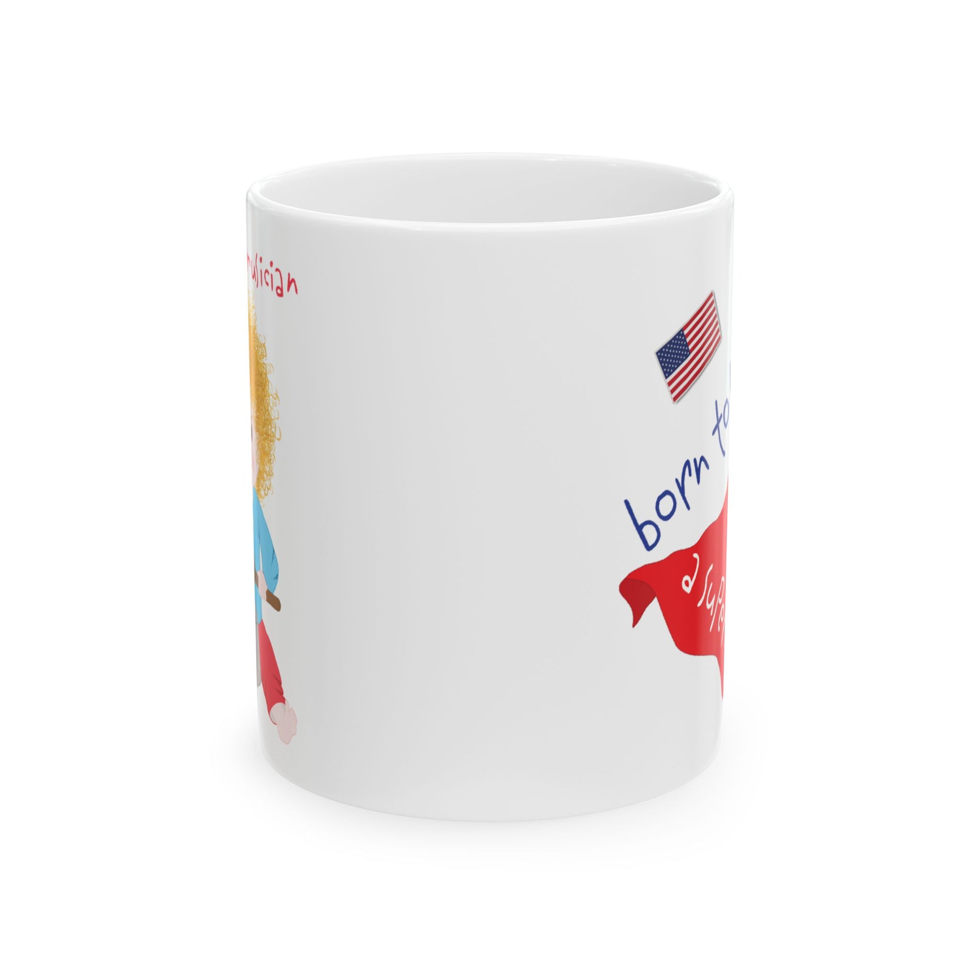 Quick Highlights: Ceramic coffee mug • Funny Superman baby artwork (front) • Bonus musician baby design on the back • Microwave & dishwasher safe • Everyday coffee & tea mug • Designed in the USA • FREE U.S. shipping