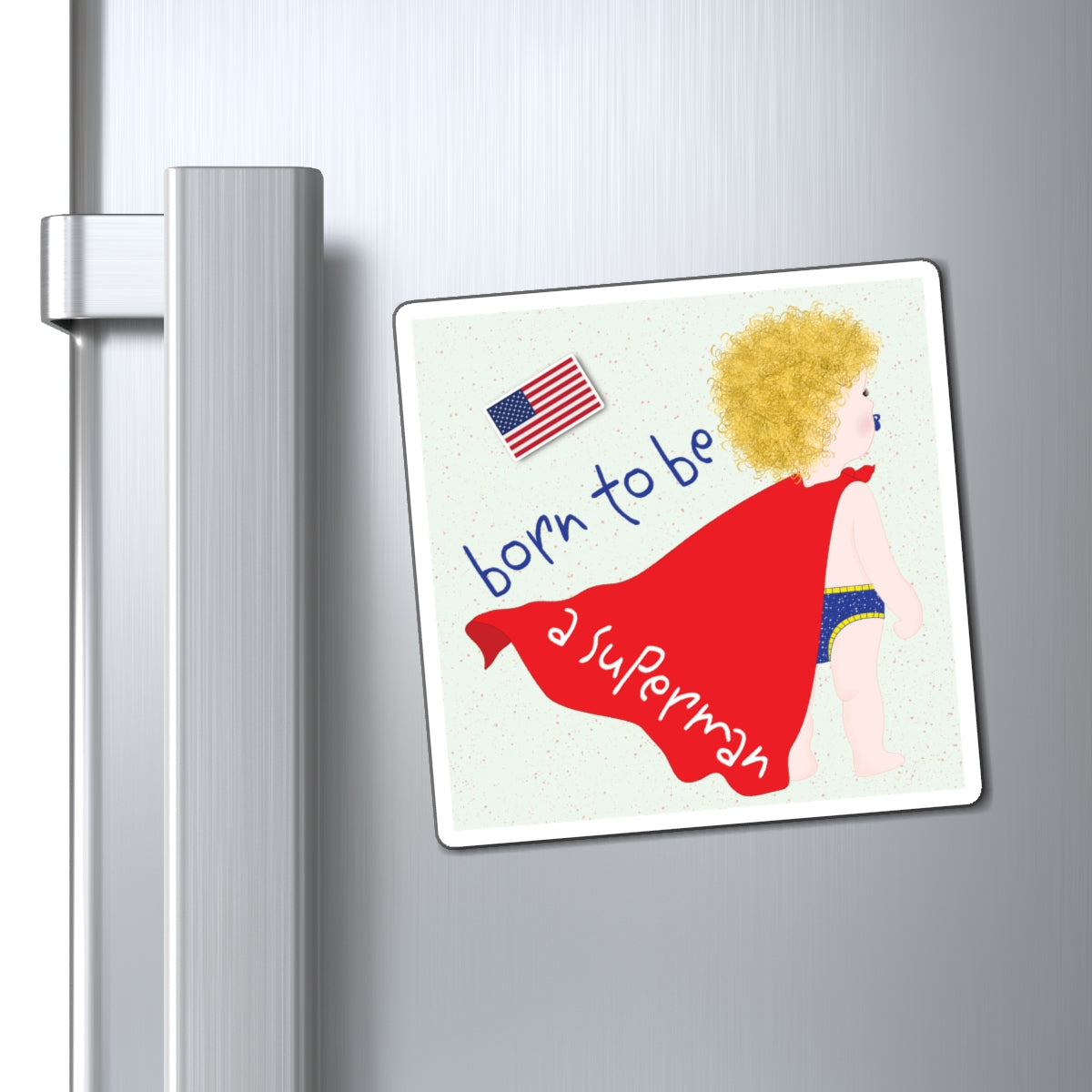Humorous blonde superman baby fridge magnet, humorous superhero gift for baby boy, Free U.S. Shipping🧲