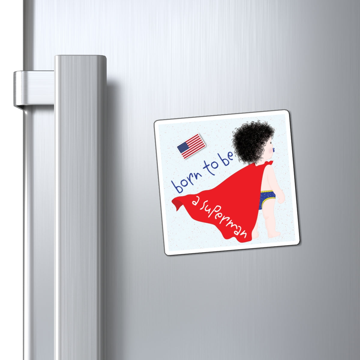 The Funny Dark-Haired Superman Baby Fridge Magnet from Kidlic is no ordinary kitchen accessory — it’s a hilarious baby gift for little heroes with serious confidence. Featuring bold dark curls, a flowing red cape, and the iconic phrase “Born to Be a Superman”, this superhero baby magnet adds comic-book attitude to snack raids, grocery lists, and fridge-door masterpieces. Proud parents and grandparents love it as a funny baby shower gift across the USA, celebrating tiny heroes with big personalities.