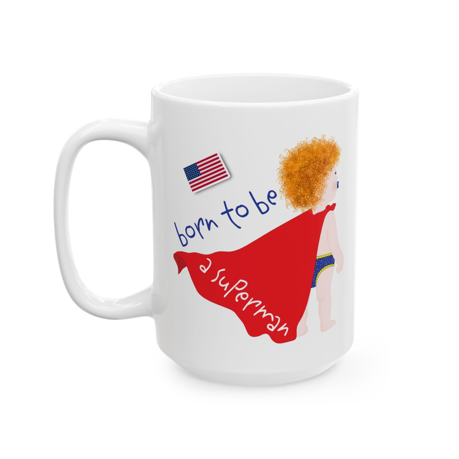 Quick Highlights: Ceramic coffee mug • Funny musician baby artwork (front) • Bonus Superman baby design on the back • Microwave & dishwasher safe • Everyday coffee & tea mug • Designed in the USA • FREE U.S. shipping