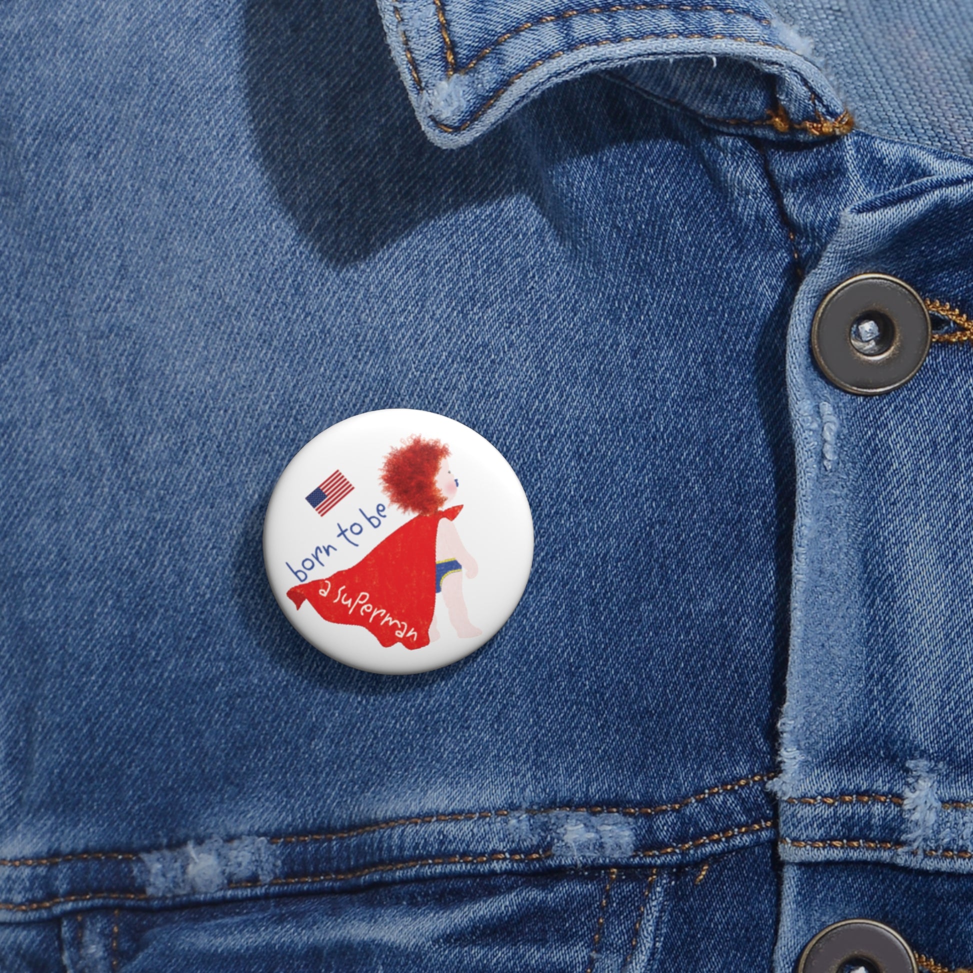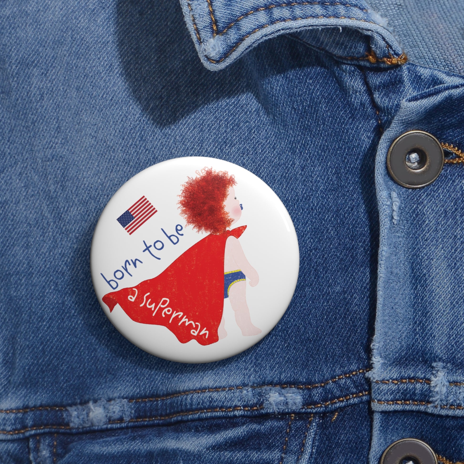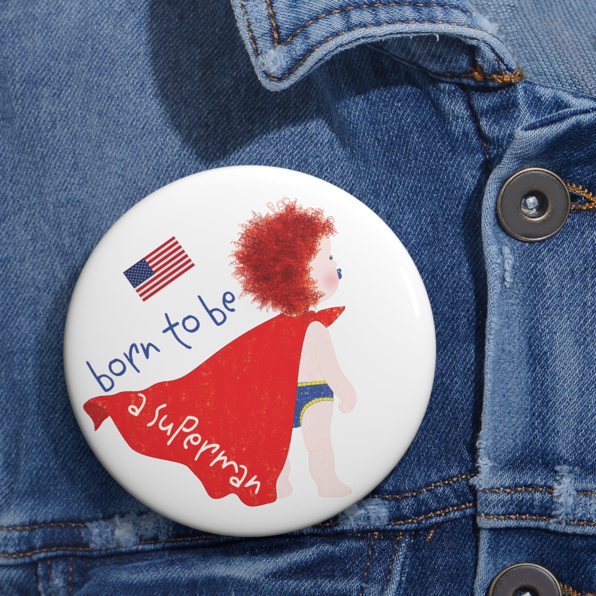 🚚 Every order ships FREE across the USA — proudly designed and delivered from the United States. Save up to 20% when you bundle this redhead Superman pin with a matching funny baby tee, funny fridge magnet, or another Kidlic original.